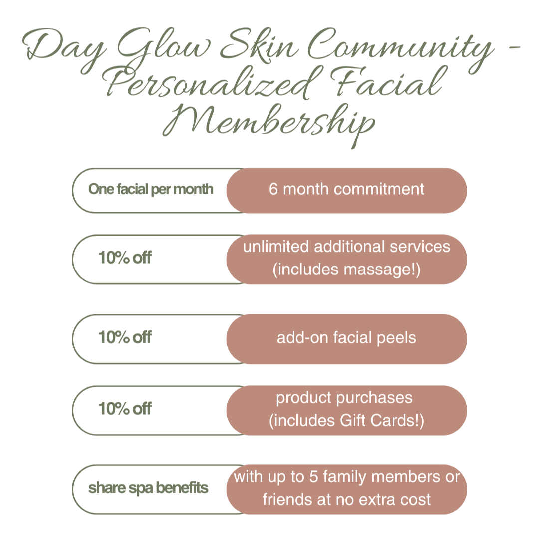 You are warmly invited to be part of something special — our Day Glow Skin Community Membership. This new membership is our way of opening the doors wide and welcoming you into the heart of our spa family.